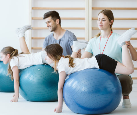 Trampoline, scooter board, linear swinging, dancing, sitting on a therapy ball, yoga, rolling, gymnastics, slides etc.